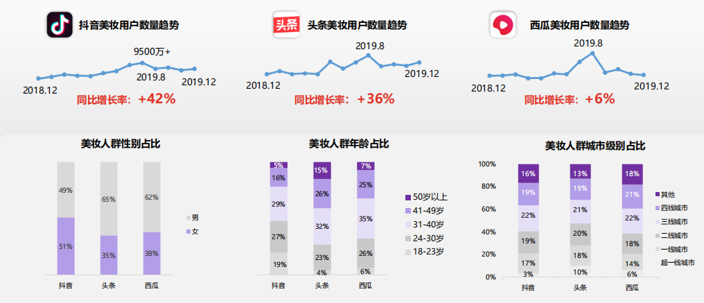 抖音、头条和西瓜平台美妆用户持续增长,共覆盖美妆用户1亿+,其中较为亮眼的依旧是抖音,抖音作为国民级短视频社交平台,在2020年特殊时期日活用户同比上涨26%,DAU4亿+,用户日均使用时长97.8min,目前美妆用户月度突破 9500万+。