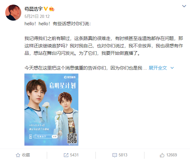 此外,在《以团之名》以组合“新风暴”出道的苟晨浩宇,在娱乐圈很长一段时间里都是“查无此人”的状态,没有通告没有作品没有曝光。直到今年5月21日,苟晨浩宇发布一条开始做淘宝直播的微博,“这条路真的很难走,有时候甚至连温饱都存在问题。我也很想有作品,想站在舞台闪闪发光。为了它们,我要开始做直播了。”