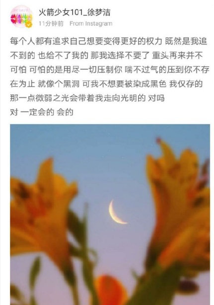 火箭少女成员徐梦洁解散后的第一个动态,是在ins上面发表了一段话,“重头再来并不可怕,可怕的是用尽一切压制你,喘不过气的压到你不存在为止。” 疑似在表达自己的发展现状非常困难。她的这番话,瞬间引发了粉丝的争论,她们纷纷声讨起经纪公司,要求增加徐梦洁的曝光机会。