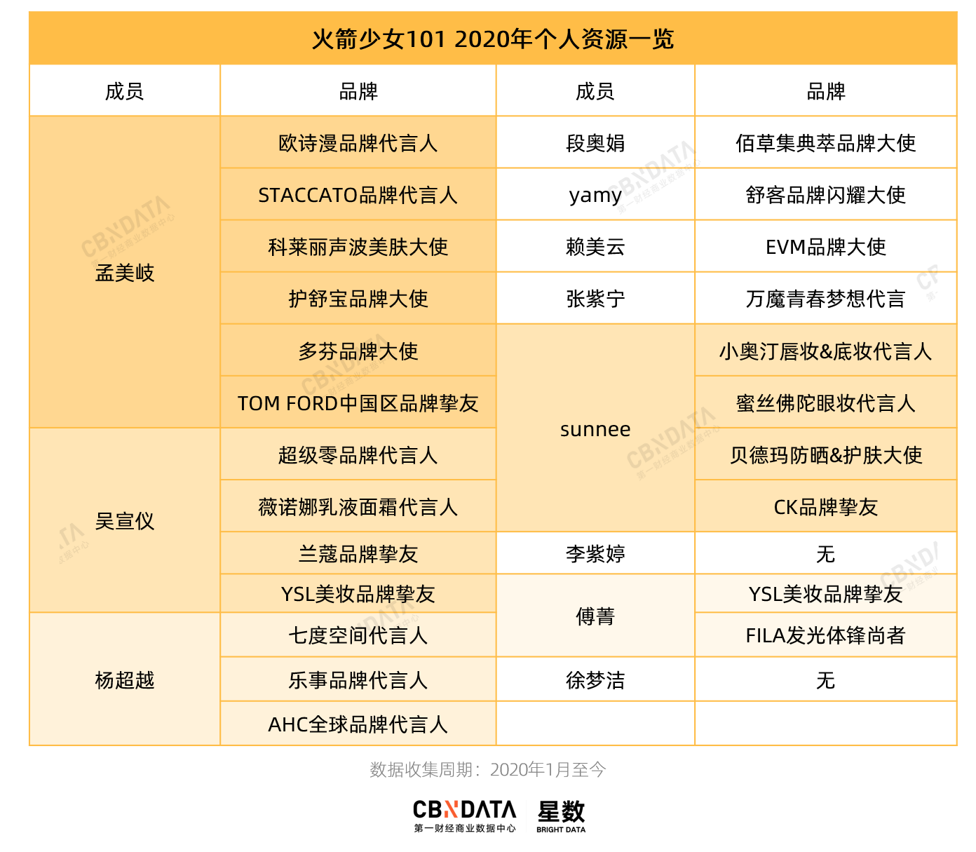 CBNData消费站整理了一份火箭少女2020年后的商业资源盘点,可以清晰看出,徐梦洁至今并无任何现存的品牌合作,李紫婷也同样如此。