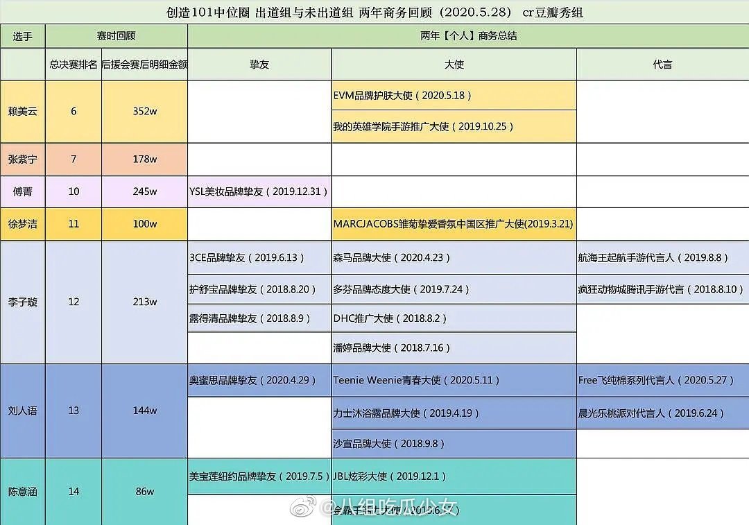 末位出道的徐梦洁处境艰难,那在《创造营101》里面并未出道的成员们发展又如何?有网友总结了当时节目中几位排名中位圈的练习生的商业资源,未出道的李子璇、刘人语、陈意涵明显要比出道的三位商务合作频繁。