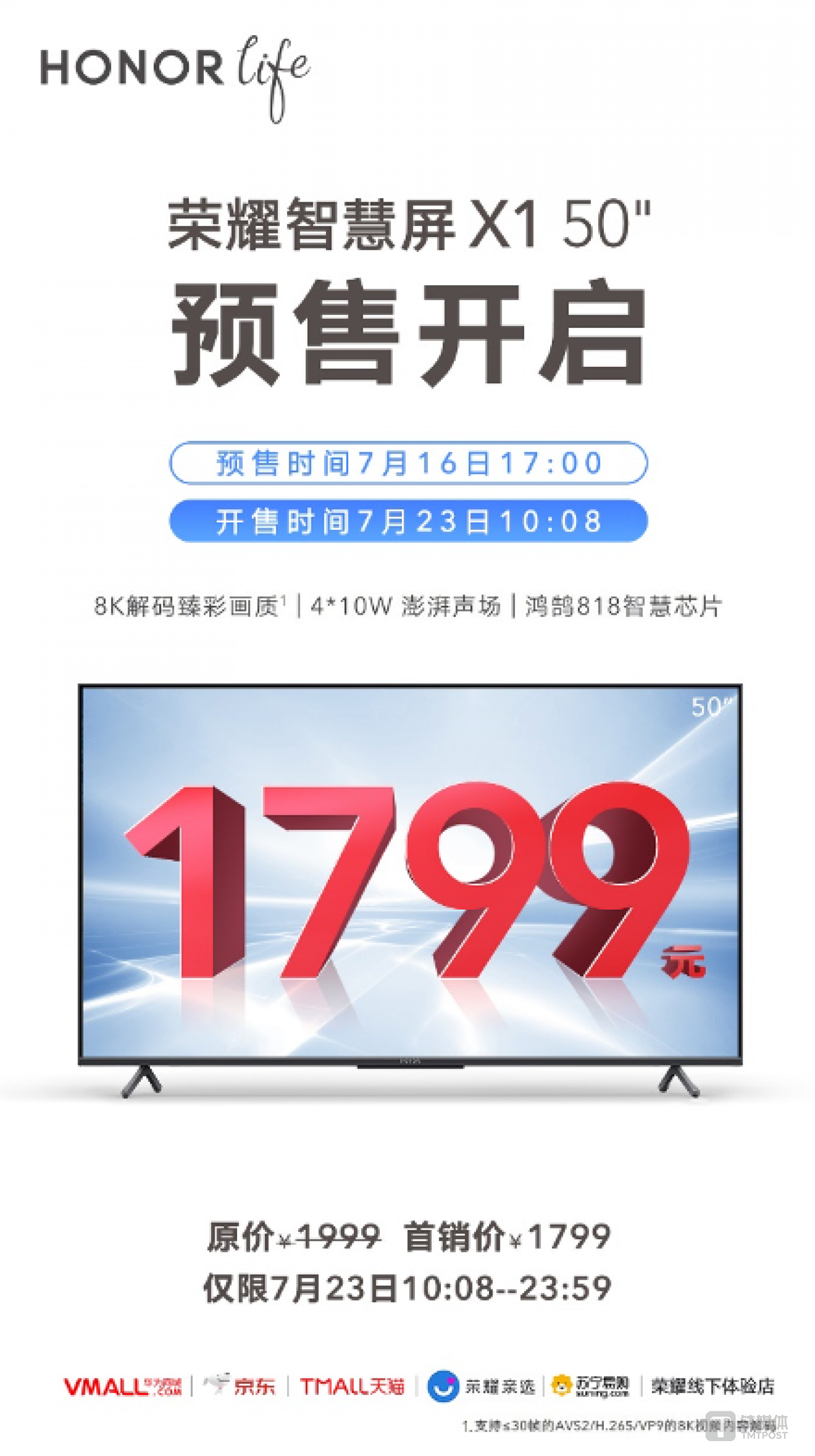 除了笔记本新品之外,荣耀还宣布荣耀智慧屏X1 50英寸版即日起也将开启预售,价格定在1799元。(本文首发钛媒体APP丨作者/唐植潇)