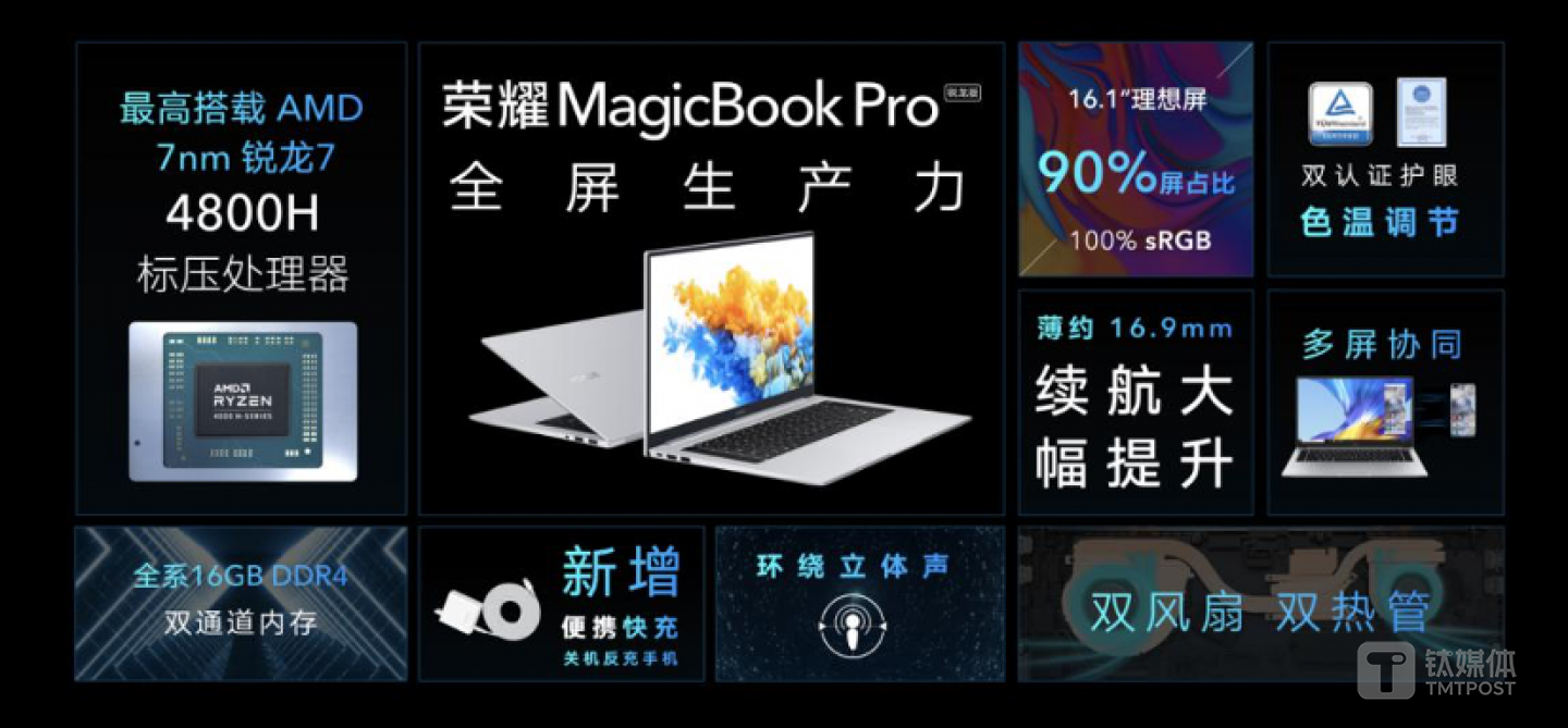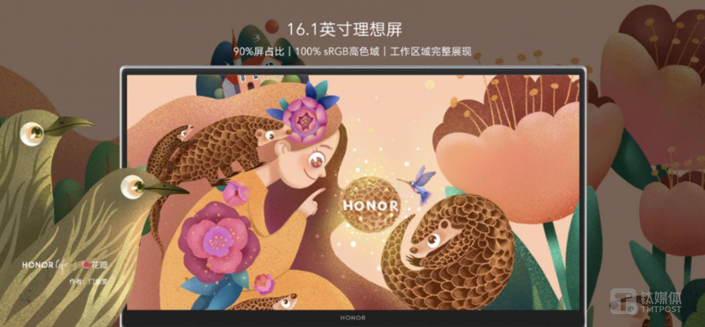 而荣耀MagicBook Pro锐龙版则在15.6英寸机身内塞入了16.1英寸屏幕,机身重量仅有1.7Kg。这块屏幕达到了90%的屏占比,300尼特亮度,覆盖了100%sRGB色域,适合设计师等职业群体的需要。