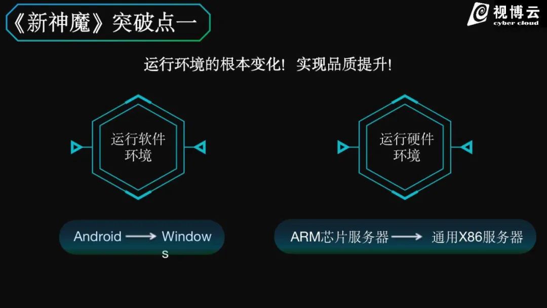 在本期高峰论坛上,视博云总裁吴君鸣详细介绍了新神魔在原生云游戏领域实现的突破。新神魔的运行环境从传统ARM+安卓,切换到了通用X86服务器+标准GPU+Windows。
