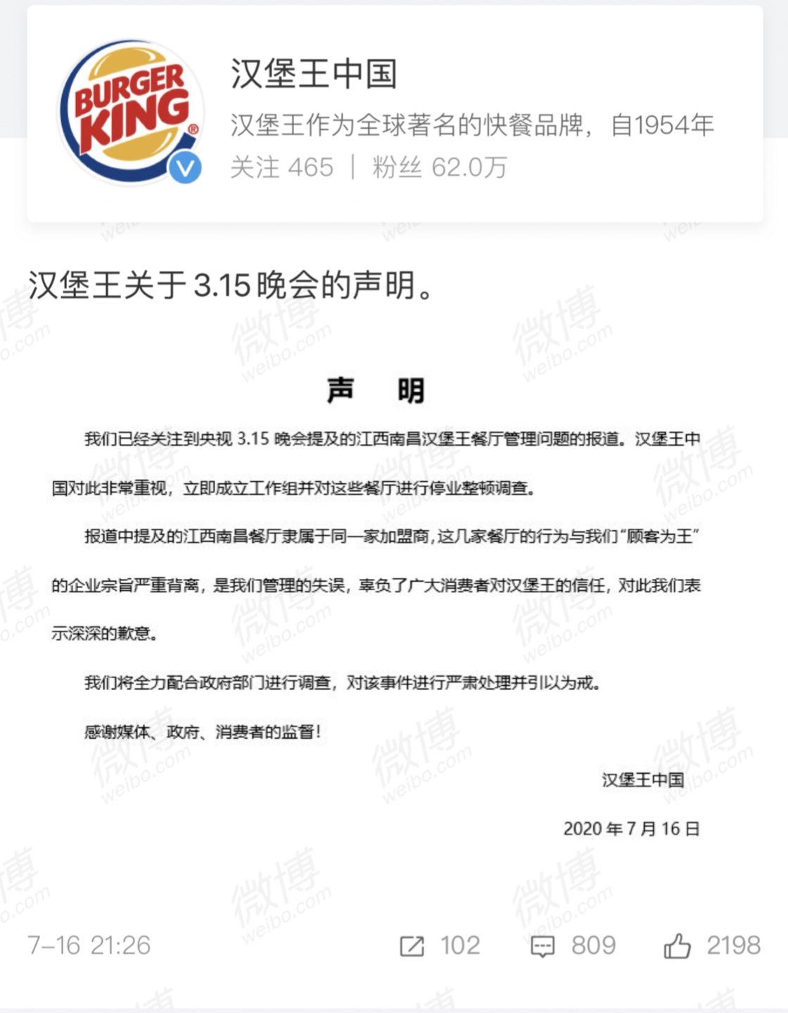 我们已经关注到央视3.15晚会提及的江西南昌汉堡王餐厅管理问题的报道。汉堡王中国对此非常重视,立即成立工作组并对这些餐厅进行停业整顿调查。