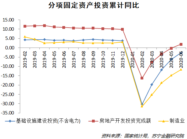 三大投资分项来看,房地产投资恢复最为明显,上半年累计同比增1.9%,较1-5月增速提高2.2个百分点,主要原因在于交易和施工同时复苏,前期投资资金来源受限的问题得到了解决;制造业投资仍然在艰难复苏中,投资意愿仍然较弱,上半年累计同比降11.7%;基建投资上半年累计同比降2.7%,尽管仍未完全恢复常态,但下半年的基建扩张仍然有一定的窗口,尤其是在制造业弱势、房地产调控加强的背景下。