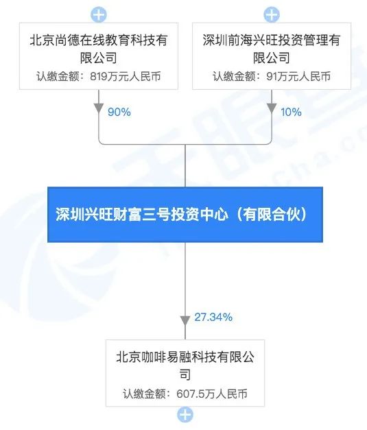 据天眼查显示,北京咖啡易融科技有限公司的第二大股东,为深圳兴旺财富三号投资中心,认缴金额为607.5万人民币,持股27.34%,而该公司是由北京尚德在线教育科技有限公司控股。另外,值得关注的是,嗨学网是由尚德机构内部孵化的项目,尚德机构先后在嗨学网的天使轮和C轮进行了注资。由此可见,这三家公司之间的确存在着一定的利益挂钩。