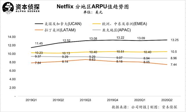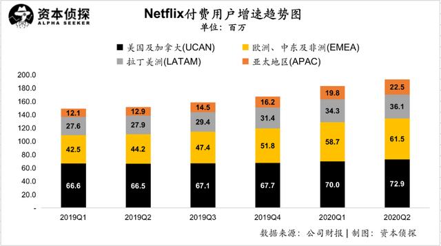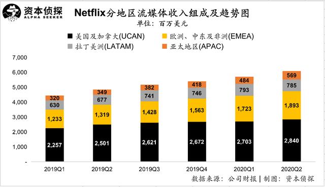 自2019年第四季度开始,Netflix将流媒体收入的统计口径从本土和国际两部分组成,转变为了美国本土及加拿大地区(UCAN)、欧洲、中东及非洲地区(EMEA)、拉丁美洲(LATAM)、亚太地区(APAC)四个部分。