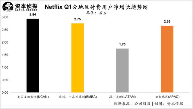 从用户数据来看,原本新增用户的主力地区欧洲、中东及非洲,在本季度的新增用户量为275万,与上一季度的新增696万相比有明显下降;原本增长趋缓的美国本土及加拿大地区,在本季度的新增用户量“反常”的拿下了净增最多的成绩,达到了294万。