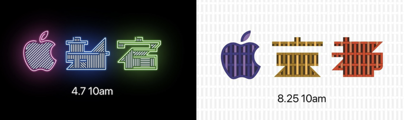 以日本近两年新增的Apple Store为例,你可以从Logo设计上就看到苹果设计的用心——新宿的现代霓虹,京都的轻质木架和特殊纸张、涉谷的年轻潮流等地区文化,都与Apple logo进行了完美融合,并且苹果都为这些logo制作了一个小短片。