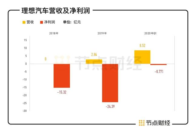 招股书显示,理想汽车2019年营收为2.84亿元,其中包括2.81亿元车辆销售收入。2020年Q1,公司的营收为8.52亿元,其中包括8.41亿元的车辆销售收入。