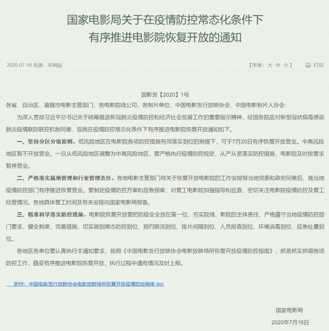 根据国家电影局下发的《关于在疫情防控常态化条件下有序推进电影院恢复开放的通知》(下称《通知》)第二条: