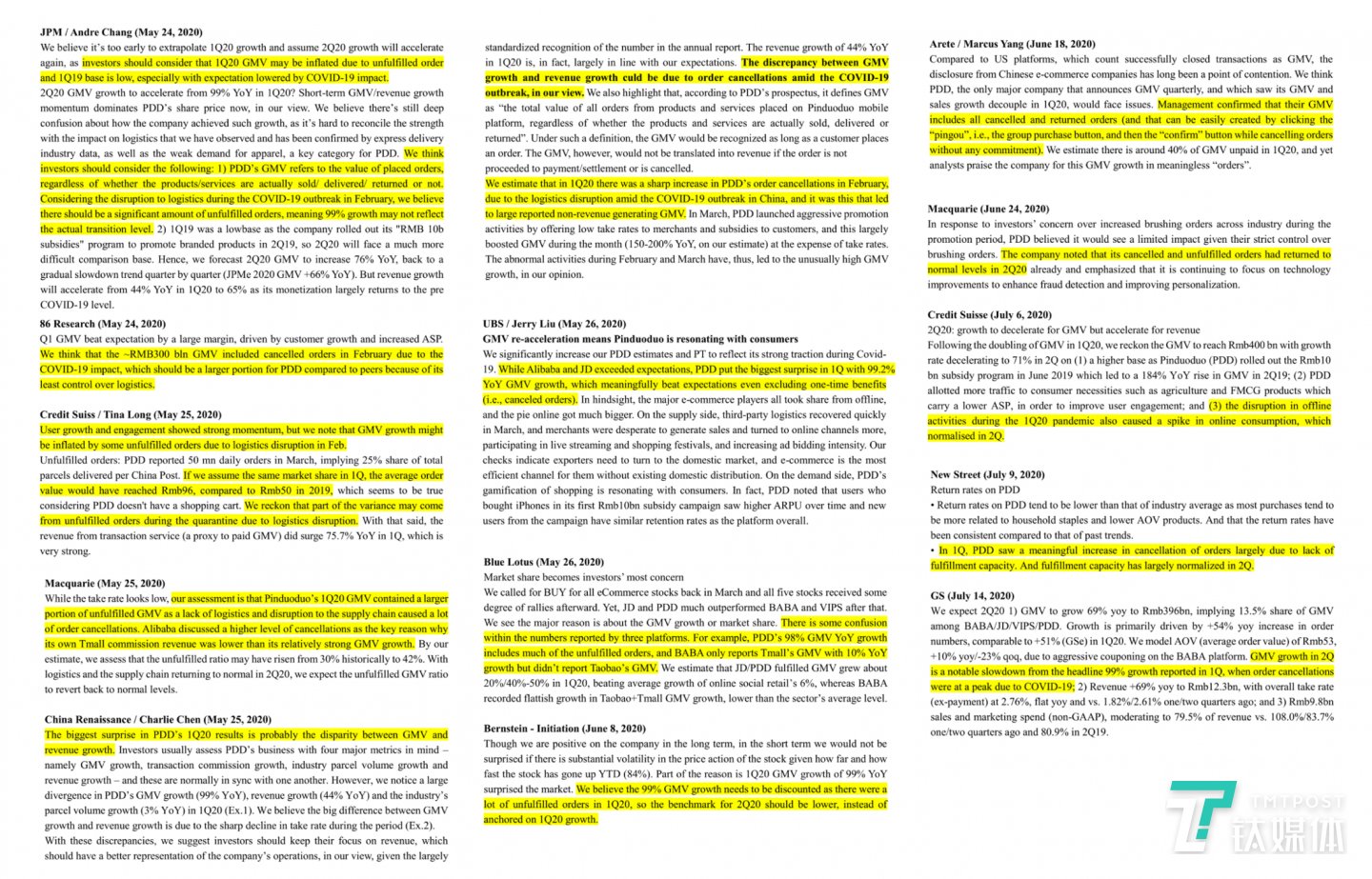 研究机构New Street报告中原文是,PDD saw a greater than normal levels of cancellation of orders or undelivered products due to lack of fulfillment capacity. Hence, part of the reported GMV in 1Q has some one-off distortion that is not part of the normal course of business. 意思是,一季度受疫情影响,因缺乏履约能力而取消订单或未交货的情况高于正常水平。因此,一季度报告中的GMV数据有一些一次性的失真。