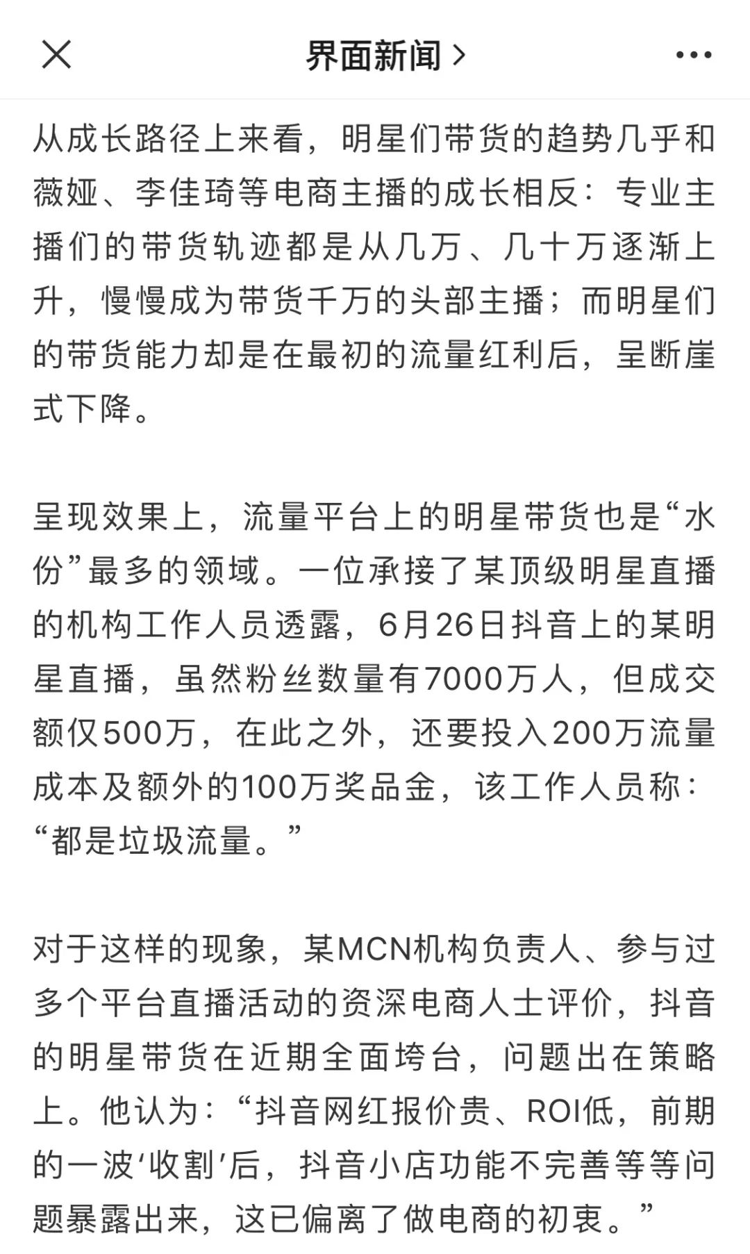 “抖音网红报价贵、ROI低,前期的一波‘收割’后,抖音小店功能不完善等等问题暴露出来,这已偏离了做电商的初衷。”有MCN机构负责人、参与过多个平台直播活动的资深电商人士日前在接受媒体采访时坦言,抖音明星带货近期全面垮塌的问题出在策略上。