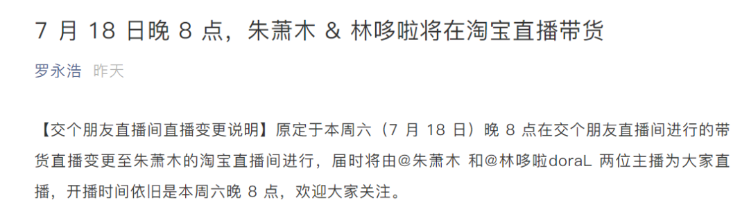 也就是说,把7月18日这场淘宝直播由自己公司的“交个朋友直播间”改成了同事朱萧木的个人直播间。这似乎是一种无言的退让:这场直播不再是老罗公司的公司行为,而只是朱萧木的个人直播。