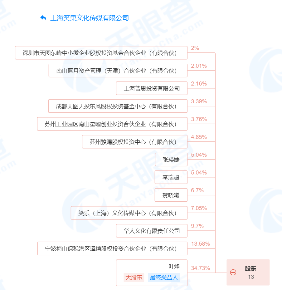 在笑果文化的股东构成中,李诞(原名李瑞超)持股比例为5.04%,比“国民老公”王思聪旗下的上海普思还高出一倍多。