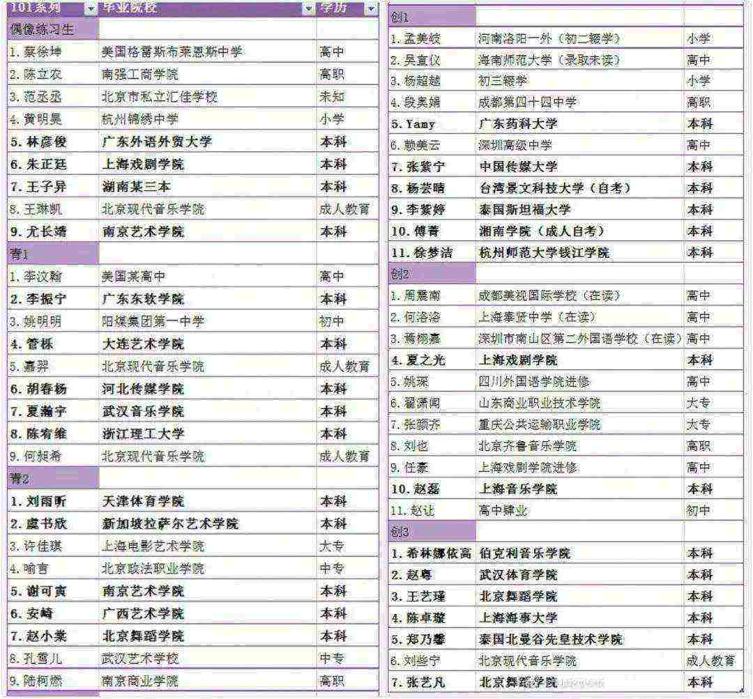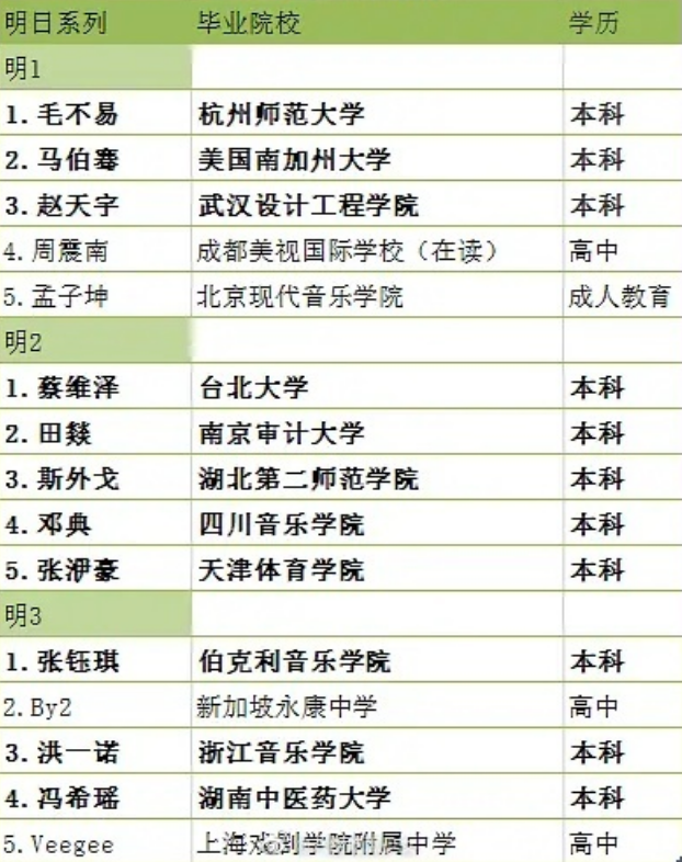 比如,头部偶像经纪公司乐华的艺人学历普遍偏低,孟美岐初二辍学,黄明昊则是小学学历。火箭少女被网友称为"101系学历最低女团",除了孟美岐,初三辍学的杨超越也只有小学文凭。创2出道的R1SE,11人中只有2人是本科学历。