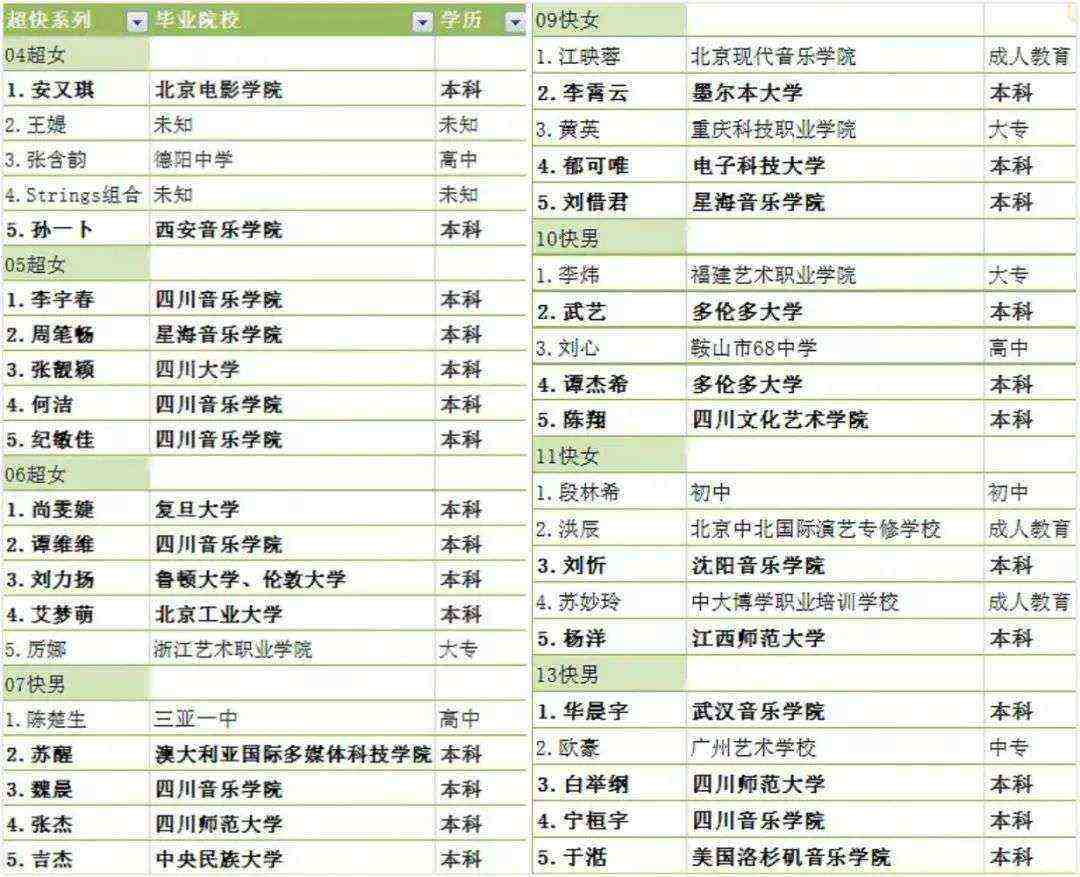 可以看到,选秀偶像早期多为艺术院校本科毕业,超女快男中"xx音乐学院"为多,其中四川音乐学院为偶像市场输送了李宇春、何洁、谭维维、魏晨、邓典等多位选手,堪称内娱选秀的"黄埔军校"。此外,周笔畅、刘惜君来自星海音乐学院,华晨宇毕业于武汉音乐学院,均是所谓"科班出身"的参赛者。