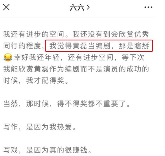 “我觉得黄磊当编剧,那是瞎掰……等下次我能欣赏黄磊作为编剧而不是演员的成功的时候,我才配得奖”,7月17日,知名编剧六六的率先“发难”,将自己和黄磊送上了热搜。事情缘起是在白玉兰奖最佳编剧(改编)的提名中,黄磊担任编剧的《小欢喜》、和六六的《安家》一起入围。
