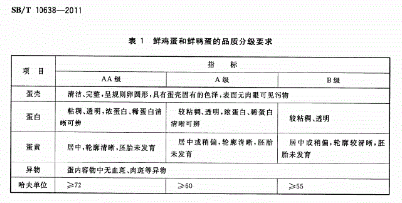 但其实,给“好鸡蛋”下一个标准,国家标准委、行业团体协会等早就在做。国家商务部2011年就发布了一套《鲜鸡蛋、鲜鸭蛋分级》标准(SB/T10638-2011),主要按哈夫值(新鲜度),把鲜蛋分为AA级、A级、B级三个档次。