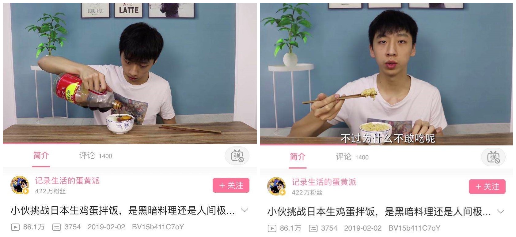 B站博主挑战生鸡蛋酱油拌饭 | 图片来源:B站