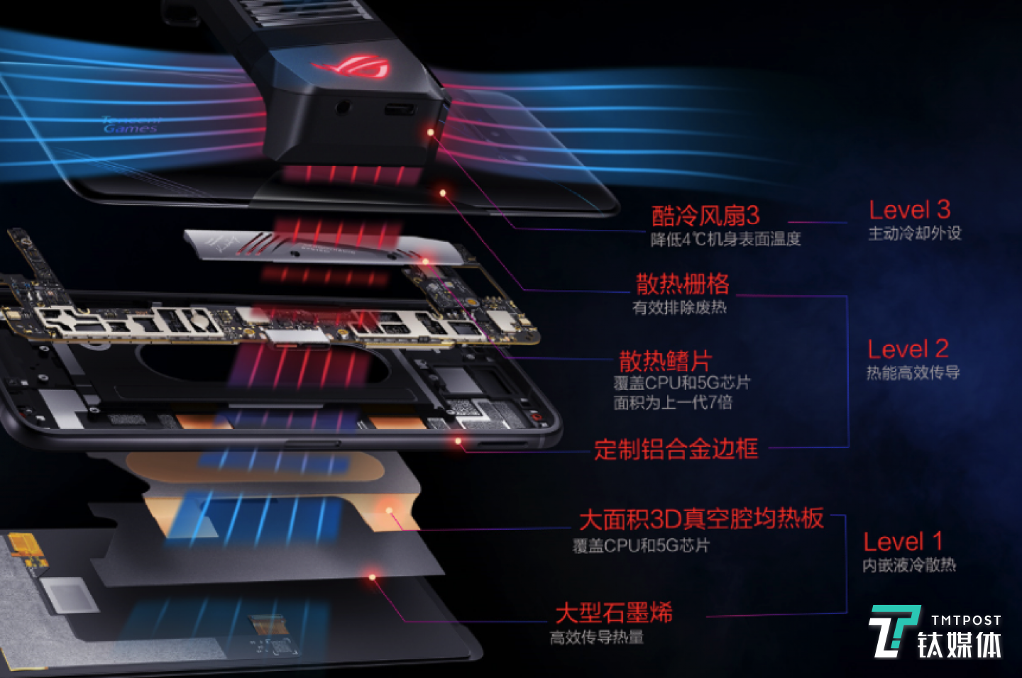 为了解决5G和SoC模块带来的高热量,ROG游戏手机3后壳使用透明视窗设计,散热架构升级为矩阵式液冷散热架构3.0。