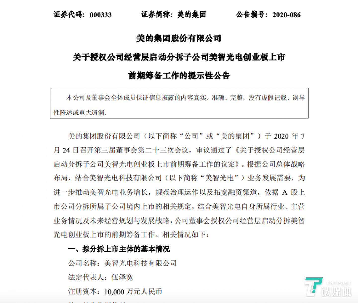 钛媒体快讯 | 7月27日消息:美的集团对外发布公告称,根据公司总体战略布局,结合美智光电科技有限公司(以下简称“美智光电”)业务发展需要,为进一步推动美智光电业务增长,规范治理运作以及拓宽融资渠道,依据A股上市公司分拆所属子公司境内上市的相关规定,结合美智光电自身所属行业、主营业务情况及未来经营规划与发展战略,公司董事会授权公司经营层启动分拆美智光电创业板上市的前期筹备工作。