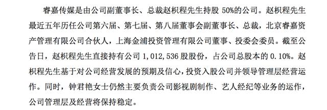 欢瑞世纪的官方网站上,对于赵枳程是这样介绍的:拥有10年以上投资相关经历,曾任深圳弘道天瑞投资有限责任公司总裁,云龙美元基金合伙人。加入欢瑞世纪后,大力推动公司发展,于2016年成功实现深交所主板上市;主导负责上市公司投资、运营及全方位资本运作。