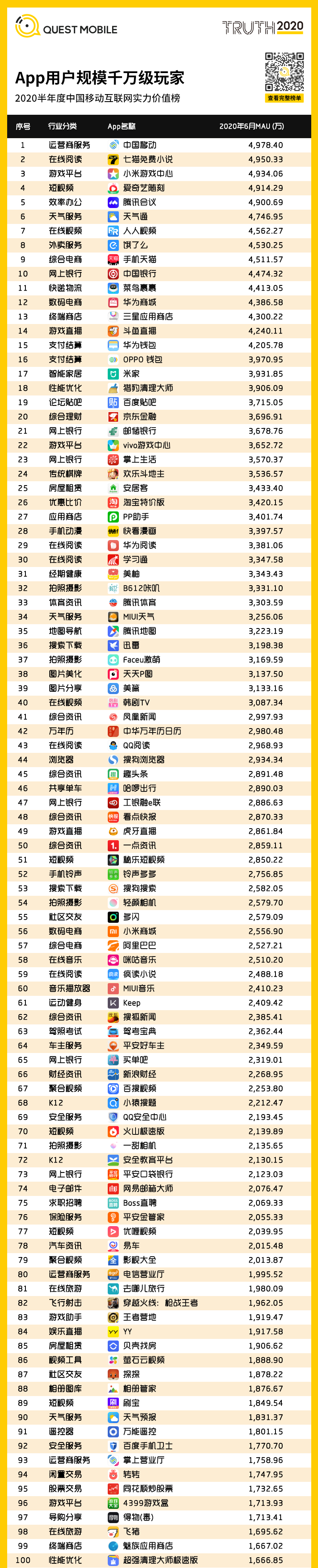 QuestMobile数据显示,上半年疫情影响,全网月活用户在5月份达到11.64亿之后,6月份微微回落,月均MAU11.55亿(2019年月均MAU11.35亿、2018年月均MAU11.09亿),用户时长、用户打开APP个数,较去年同期稳中有涨,各领域也出现不同趋势,以视频为例:短视频快速增长,行业MAU已经达到8.52亿,在线视频则持续下跌至8.57亿,同时,短视频的时长已经占据总时长份额的20%,仅次于即时通讯了……