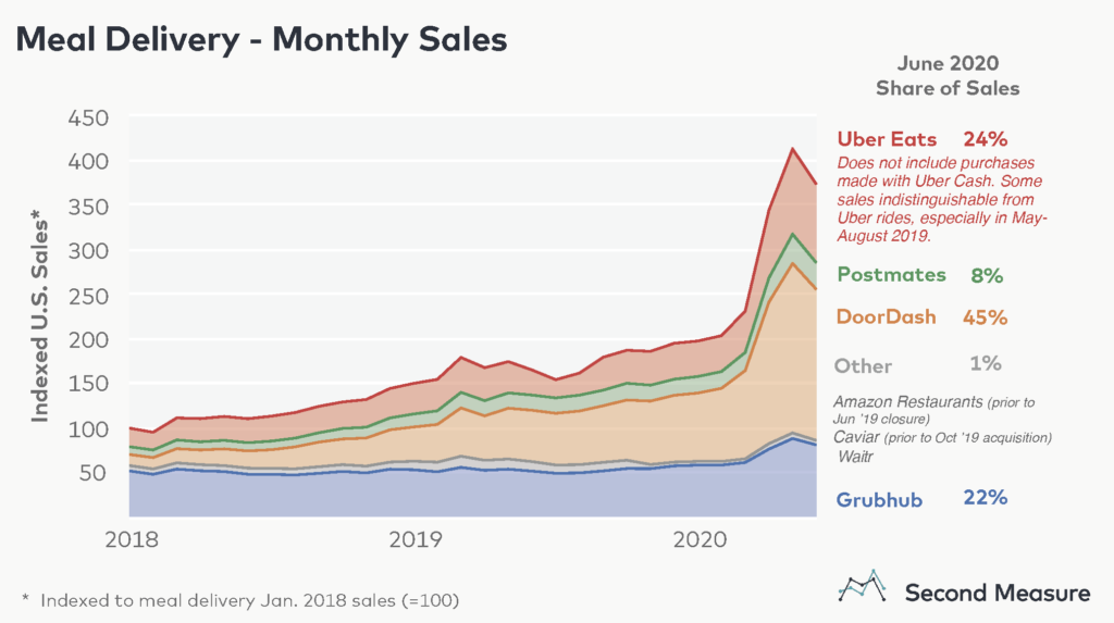 根据Second Measure对美国各大外卖平台月度销售额的统计报告显示,今年6月,DoorDash以45%的市场占有率几乎抢占了美国外卖市场的一半江山,Uber Eats和Grubhub的业务空间基本相当,分别以24%和22%位居其后,而Postmates则以8%的市场份额常年稳居第四。