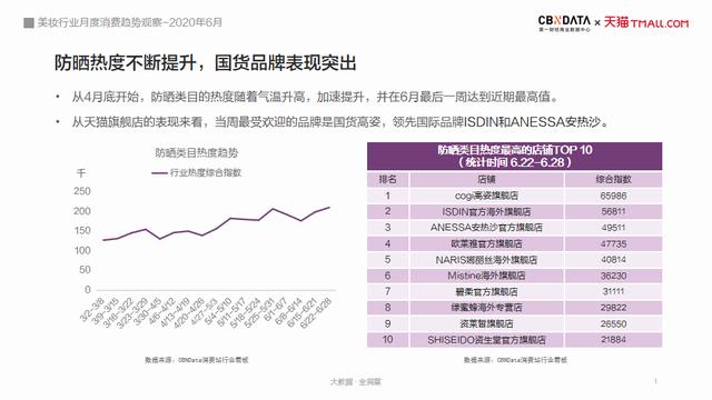 从4月底开始,防晒类目的热度就开始随着气温的升高加速提升,并在6月最后一周达到近期最高值。6月天猫平台新品销售情况最好的ISDIN怡思丁官方海外旗舰店,其主打商品正是防晒产品。