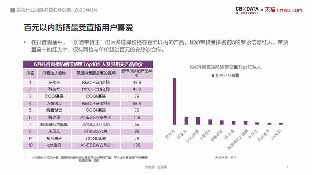 尽管需求有升级,但“平价大碗”依旧是消费者选购防晒用品时的重要考量,百元以内的防晒霜最受欢迎。在抖音直播中,“防晒带货王”们也大多选择价格百元以内的产品。抖音防晒带货量top 10的达人中,仅有两位与单价超过百元的安热沙合作。