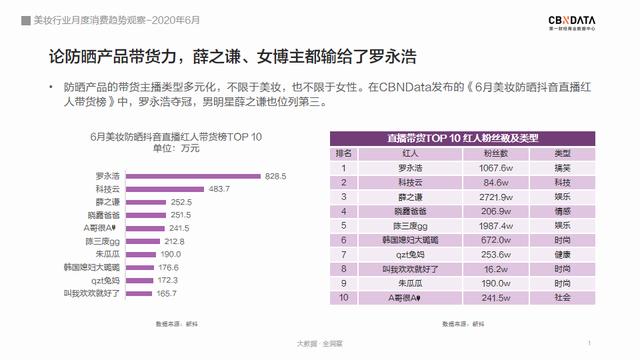 直播带货的兴起,也让美妆销售模式更多元。以防晒霜为例,根据新抖统计,6月仅抖音平台就有超过1.2万场直播带货防晒产品。中年男、科技KOL也来跨界卖防晒,并显示出惊人带货力。罗永浩单场直播就卖出价值近800万元的防晒霜!带货能力远超明星薛之谦及一众女性带货达人。