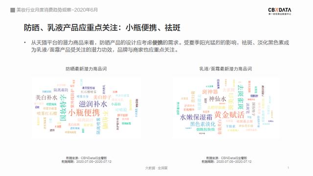 猛烈的紫外线下,防晒自是刻不容缓,晒后修复也必不可少。6月以来,祛斑、淡化黑色素等成为乳液、面霜类产品最受关注的潜力功效。防晒、祛斑双管齐下的消费需求,品牌、商家们应予以重点关注。