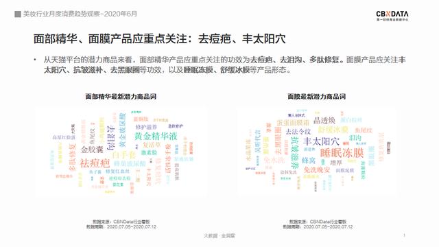 除了“丰太阳穴”,去泪沟、去痘疤、去黑眼圈等细分需求也成为面部精华、面膜类产品最新潜力商品词。人们变美的需求越来越细致了。