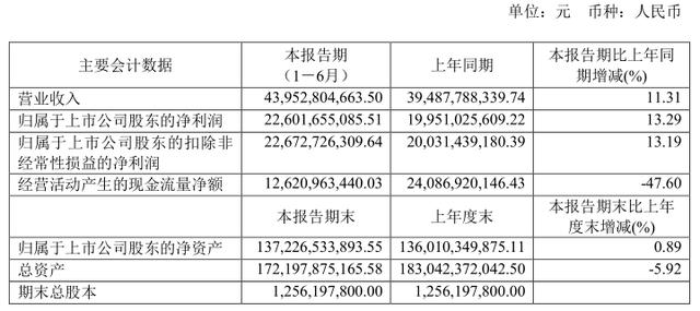 7月28日,贵州茅台发布2020年半年度报告。公告显示,报告期内,公司完成基酒产量4.81万吨,其中茅台酒基酒产量3.67万吨、系列酒基酒产量1.14万吨。公司上半年实现营业收入439.53亿元,同比增长11.31%;净利润226.02亿元,同比增长13.29%。