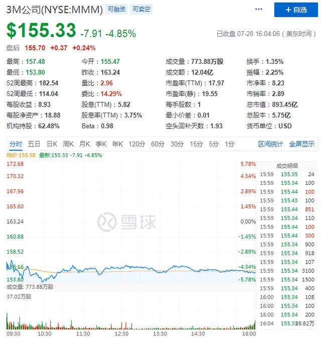 美东时间7月28日盘前,世界著名多元化技术公司——3M发布了截至2020年6月30日的2020财年二季度业绩报告。资本市场和投资者显然对这份财报不甚满意,截至周二收盘3M股价跌幅为4.85%,每股报155.33美元,总市值893.45亿美元。