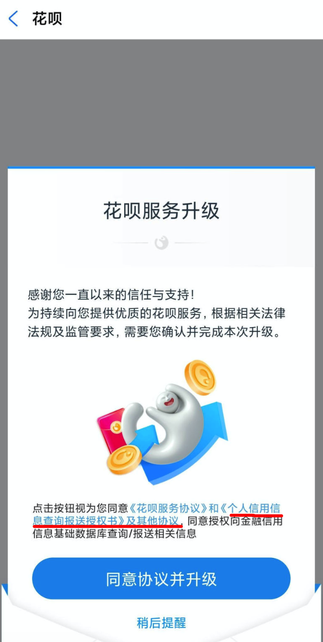 从6月开始,一些花呗用户陆续收到了花呗服务升级的通知,内容显示为:为持续向您提供优质的花呗服务,根据相关法律法规及监管要求,需要确认完成本次升级。其中,征信报送的授权书就在此次升级服务的内容中。