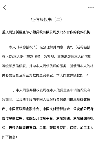 其中有一份征信授权书是同意重庆两江新区盛际小额贷款有限公司及此次合作的贷款机构查询用户征信及信用信息,也就是说这家盛际小额贷款有限公司是白条征信的上报主体。