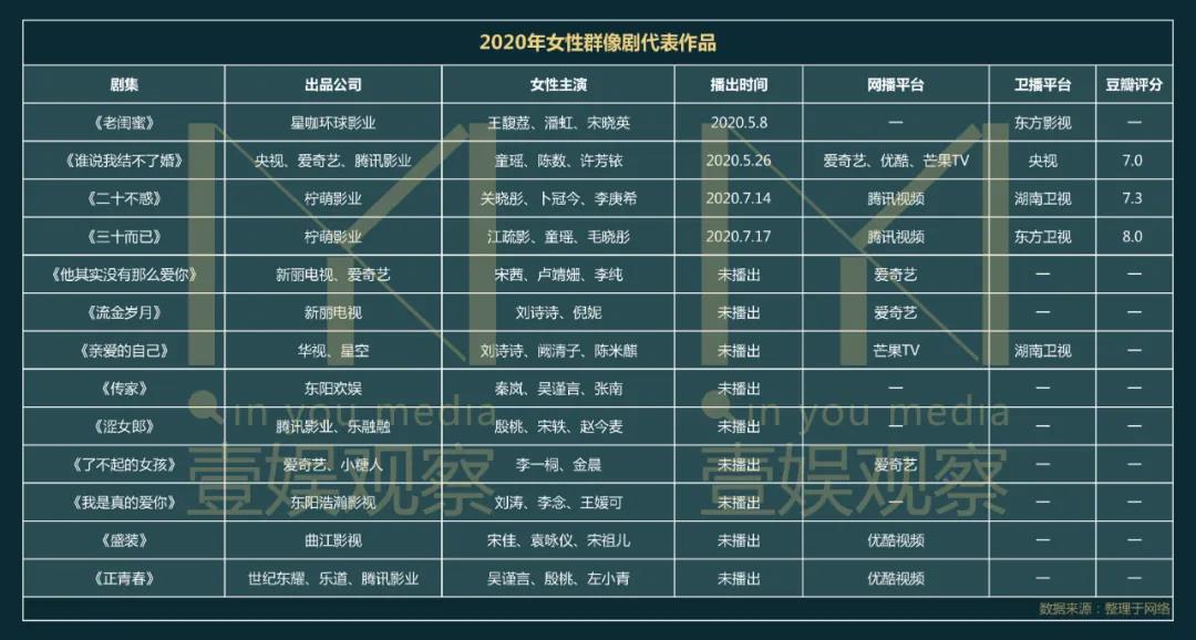 据壹娱观察不完全统计,在接下来的一段时间里,今年有近20部女性群像剧与观众见面,在人物选角、制作团队上都算是相当高配置,主演阵容中不乏刘涛、刘诗诗、宋佳、秦岚、殷桃、袁泉等中生代女演员的身影,不知道接下哪部剧能接住《三十而已》传下的接力棒?
