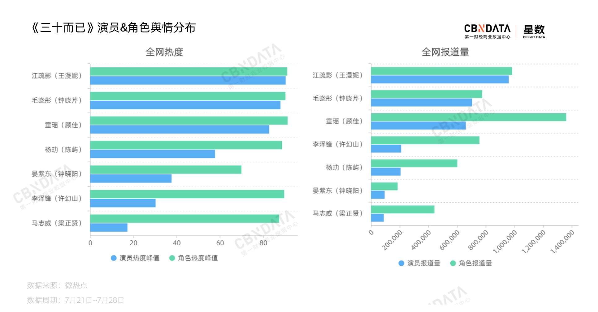 从微热点数据来看,性别成为了明显的差异点。女性演员和角色热度较为平衡,其中童谣饰演的“顾佳”一角无论是热度还是全网报道量均排名第一,甚至超出第一番位的江疏影极其饰演的角色“王漫妮”。