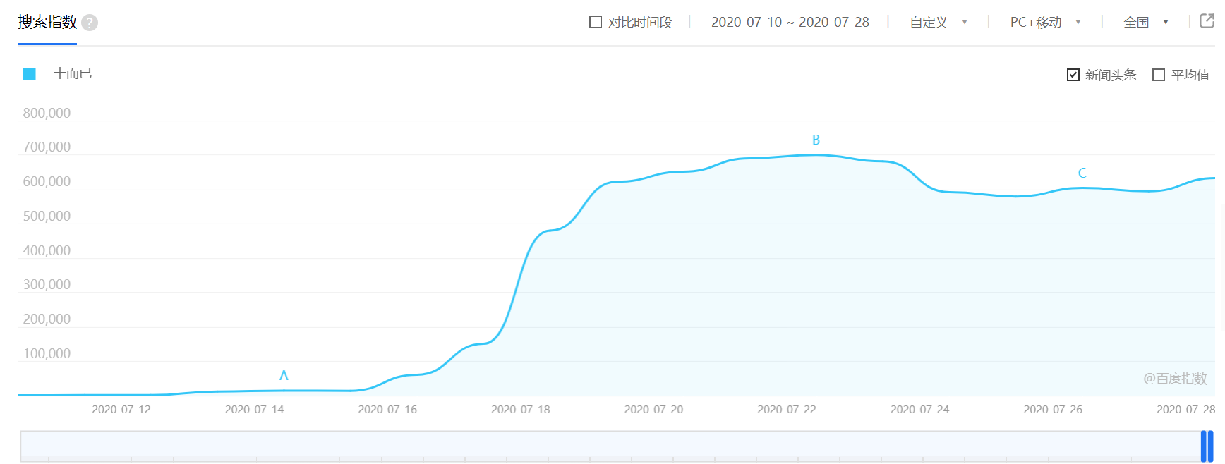 从百度指数来看,《三十而已》开播以来,热度持续攀升,搜索指数基本稳定在60万左右。