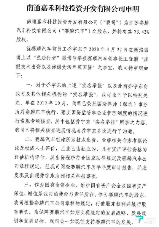 对于乔宇东举报所涉及的内容,南通嘉禾方面最初持否认的态度。4月29日,也就是这名“法务经理”公开举报的第二天,南通嘉禾发表声明称,已于去年10月开始进行相关核查,并称“江苏赛麟组建所涉的技术出资,已经相关专家考察讨论及权威人士评价,业已由独立的、具有资产评估资格的评估机构评估,出资符合国家法律规定及赛麟汽车公司章程规定。经查阅赛麟汽车历年年度审计报告,并未发现及出现乔宇东所列相关举报事项。”