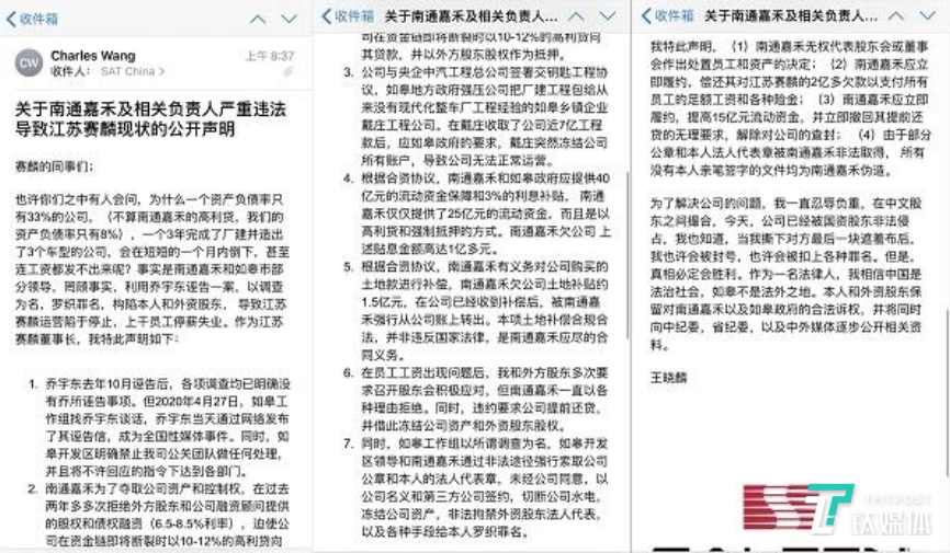 6月30日,全体员工均收到了王晓麟发送的《关于南通嘉禾及相关负责人严重违法导致江苏赛麟现状的公开声明》。声明中称:“在员工工资出现问题后,我和外方股东多次要求召开股东会积极应对,但南通嘉禾一直以各种理由拒绝,同时违约要求公司提前还贷,并借此冻结公司资产和外资股东股权。”