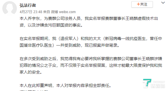 4月27日,名为“弘法行者”的微博账号发布了自称为乔宇东本人的举报信息(上图),举报王晓麟“虚假技术出资和涉嫌贪污巨额国资”。乔宇东曾是赛麟汽车员工,在职期间的职务是赛麟汽车的法务经理。其在举报信中对江苏赛麟汽车提出了四方面指控: