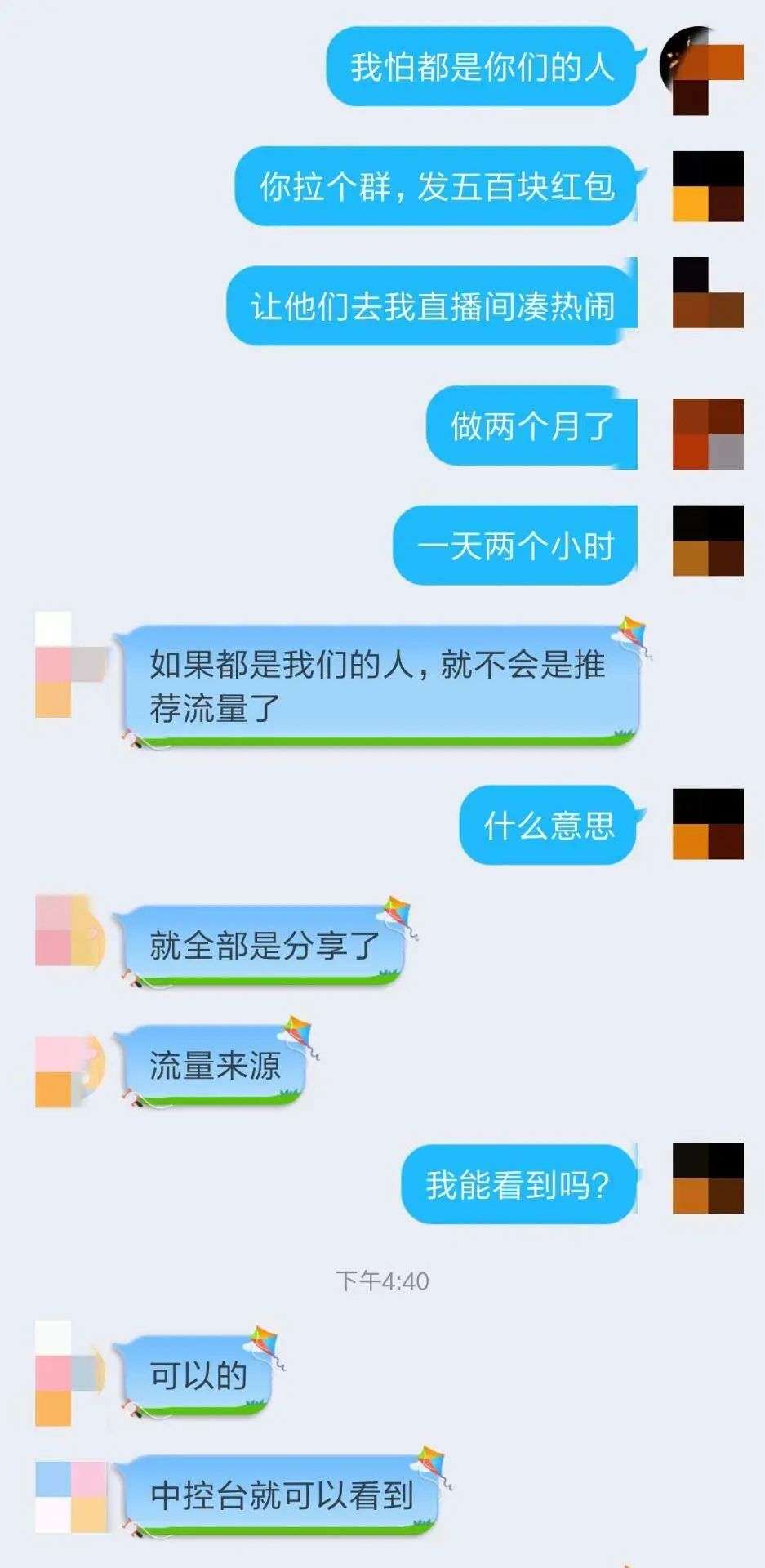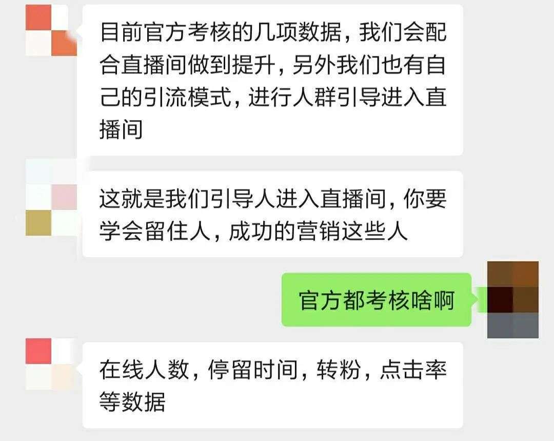 其中一个表示“公司机密不能说”,另一个收费每月15000的公司比较坦诚,称目前官方考核的几项数据,比如在线人数,停留时间,转粉,点击率等,他们会配合直播间提升权重,获得更高的曝光率。除此之外,他们也有自己的引流模式,引导人群进入直播间。