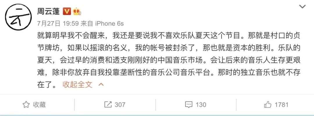 著名民谣歌手周云蓬在7月27日和7月28日这两天,连发9条原创微博表示自己不喜欢《乐队的夏天》这个节目,并称"乐队的夏天,会过早的消费和透支刚刚好的中国音乐市场。会让后来的音乐人生存更艰难,除非你放弃自我投靠垄断性的音乐公司音乐平台。那时的独立音乐也就不存在了。"
