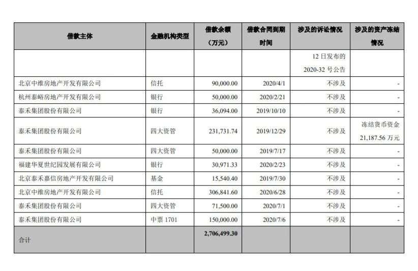 截至7月7日泰禾披露的已到期未偿付债务金额已上升至270.65亿元,占其近一年经审计归母净资产的137.38%。