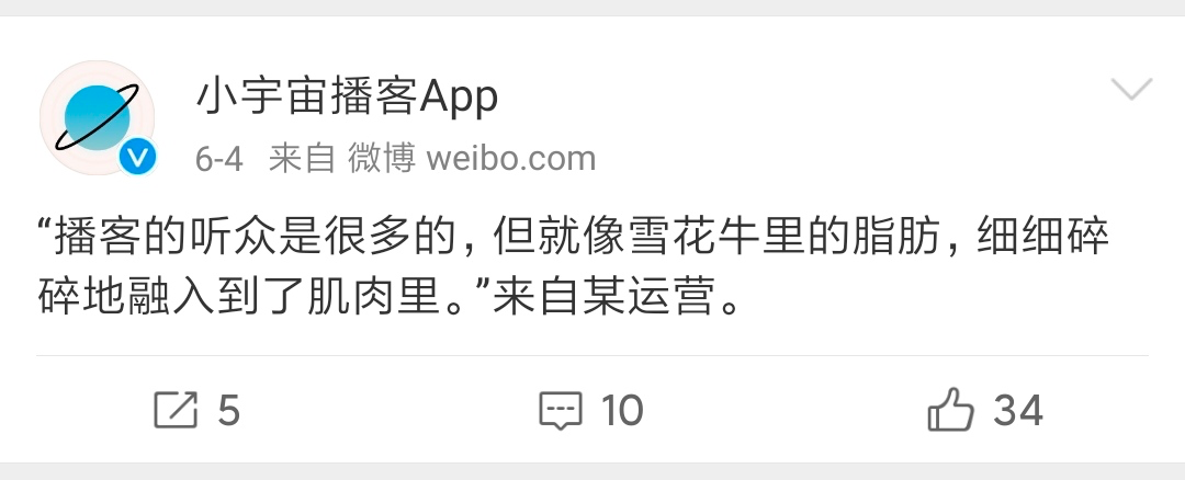 今年3月上线的播客App小宇宙曾发过这样一条微博“播客的听众是很多的,但就像雪花牛里的脂肪,细细碎碎地融入了肌肉里。”这从侧面说明播客的听众优质、高粘性但分散在各个音频平台角落里。