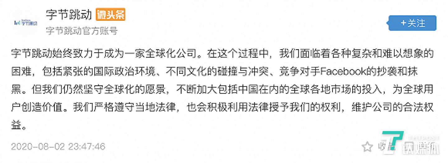 昨晚深夜,字节跳动也在其今日头条官方账号上发布了一条声明,称面对紧张的国际政治环境和竞争对手Facebook的抄袭抹黑,将积极利用法律维护公司合法利益。